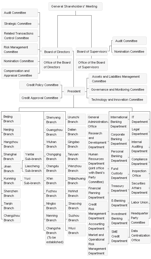 The General Shareholders' Meeting is the Bank’s highest governing body that manages and supervises the Bank through the Board of Directors. The President is responsible for the day-to-day operations and management of the Bank under the leadership of the Board of Directors.Hua Xia Bank is managed under a vertical scheme with “the Headquarter as the highest Corporate Body – Branches – Sub-branches”. The headquarter sits at the top overseeing all the activities of branches and sub-branches. All branches and sub-branches are non-independent corporate bodies running services within the ambit of the headequarter . The Headquarter has the final say in appointing/dismissing the main personnel of all branches and sub-branches, as well as service policy, rules and regulations, foreign affairs.