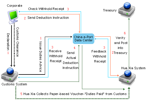 ③ Hua Xia sends "Withhold Receipt" to e-Port Data Center after processing. Customs changes the status to "Payment Successful" once receiving the "Withhold Receipt". Company starts to clear through customs with necessary documentation.