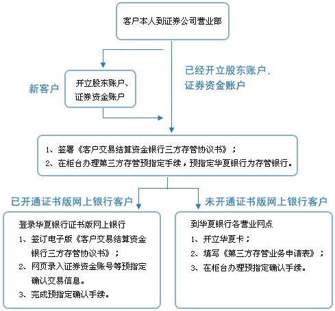 第三方存管是指投资者开通第三方存管证券服务后,华夏银行作为独立第三方为投资者提供证券交易结算资金存管、转账和存取服务,发挥银行网络、系统先进、服务专业的优势,方便投资资金存取、转账、保障客户证券交易结算资金安全。