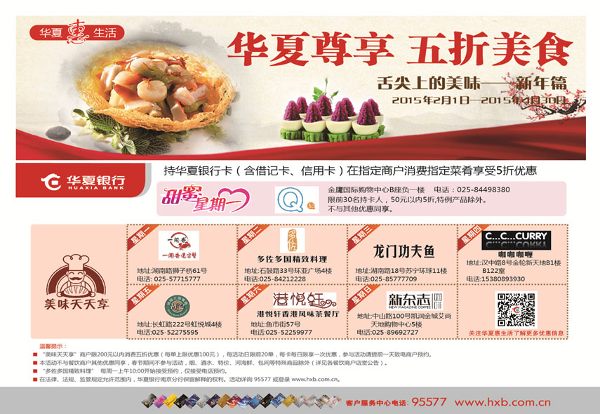 华夏银行5折美食活动品质升级,活动期间,每天一家餐饮商户5折优惠,让您“美味天天享”;每周一一家优惠甜品商户,让您过“甜蜜星期一”。具体餐饮商户及优惠内容如下: