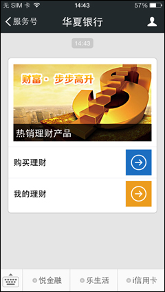 (2)Go买理财:移动微银行提供购买理财的便捷渠道,客户无需登录即可查看我行在售理财产品,并可在线购买、赎回、随时查询购买记录。