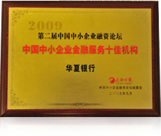 2009年9月,华夏银行中小企业信贷部被中国社会科学院金融研究所和金融时报评选为“2009中国中小企业金融服务十佳机构”。